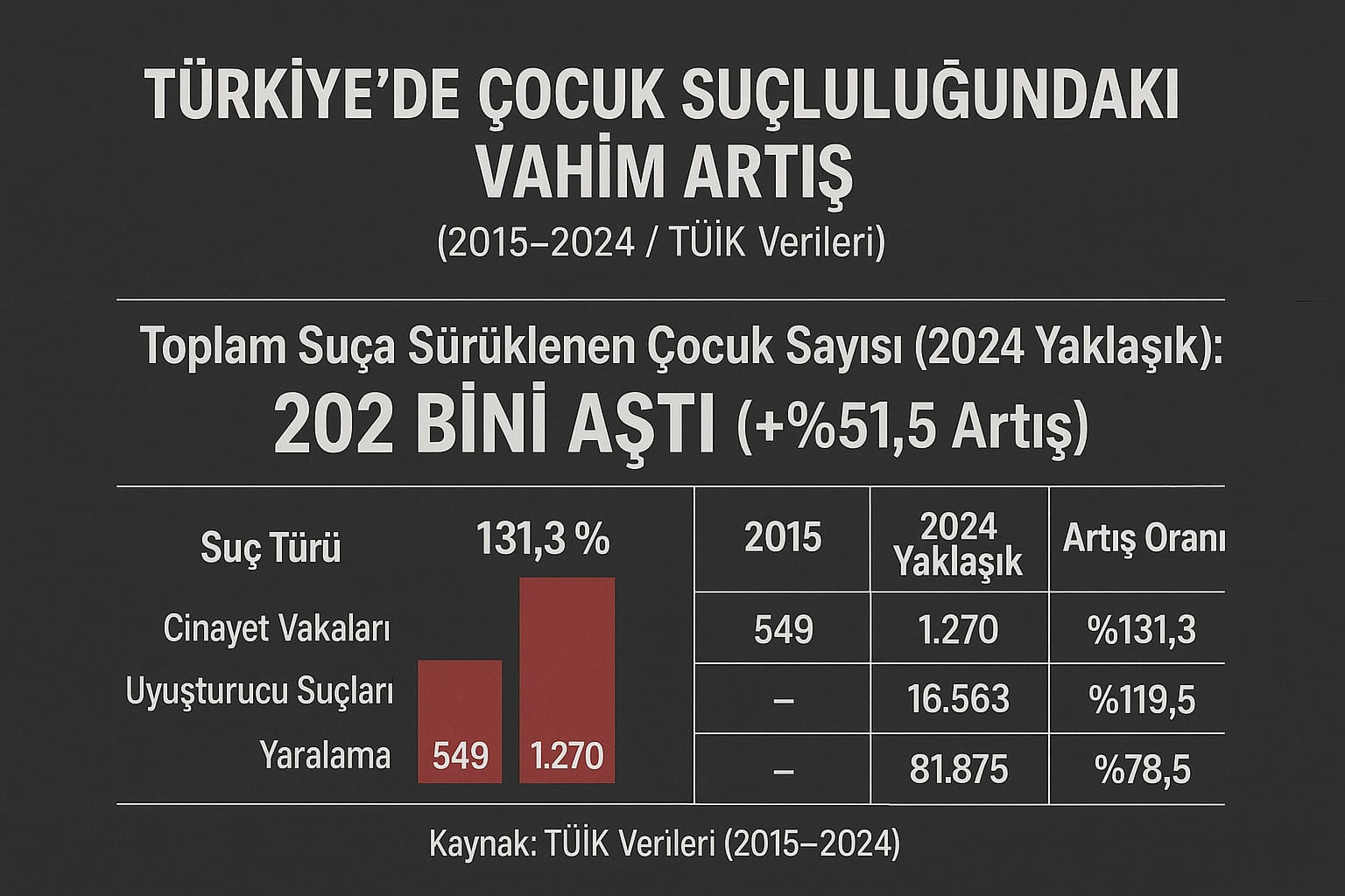Türkiye İstatistik Kurumu (TÜİK) verileri, sorunun boyutunu gözler önüne seriyor. Son dokuz yılda (2015-2024), suça sürüklenen çocuk sayısının yüzde 51,5 artışla 202 bini aşması, toplumun her kesiminden çocuğun tehlike altına girdiğini gösteriyor. Cinayet ve uyuşturucu suçlarındaki %131’i ve %119’u aşan artış, bu kuşağın çaresizlikten ve kültürel zehirden beslenen tehlikeli bir girdaba çekildiğini kanıtlıyor.