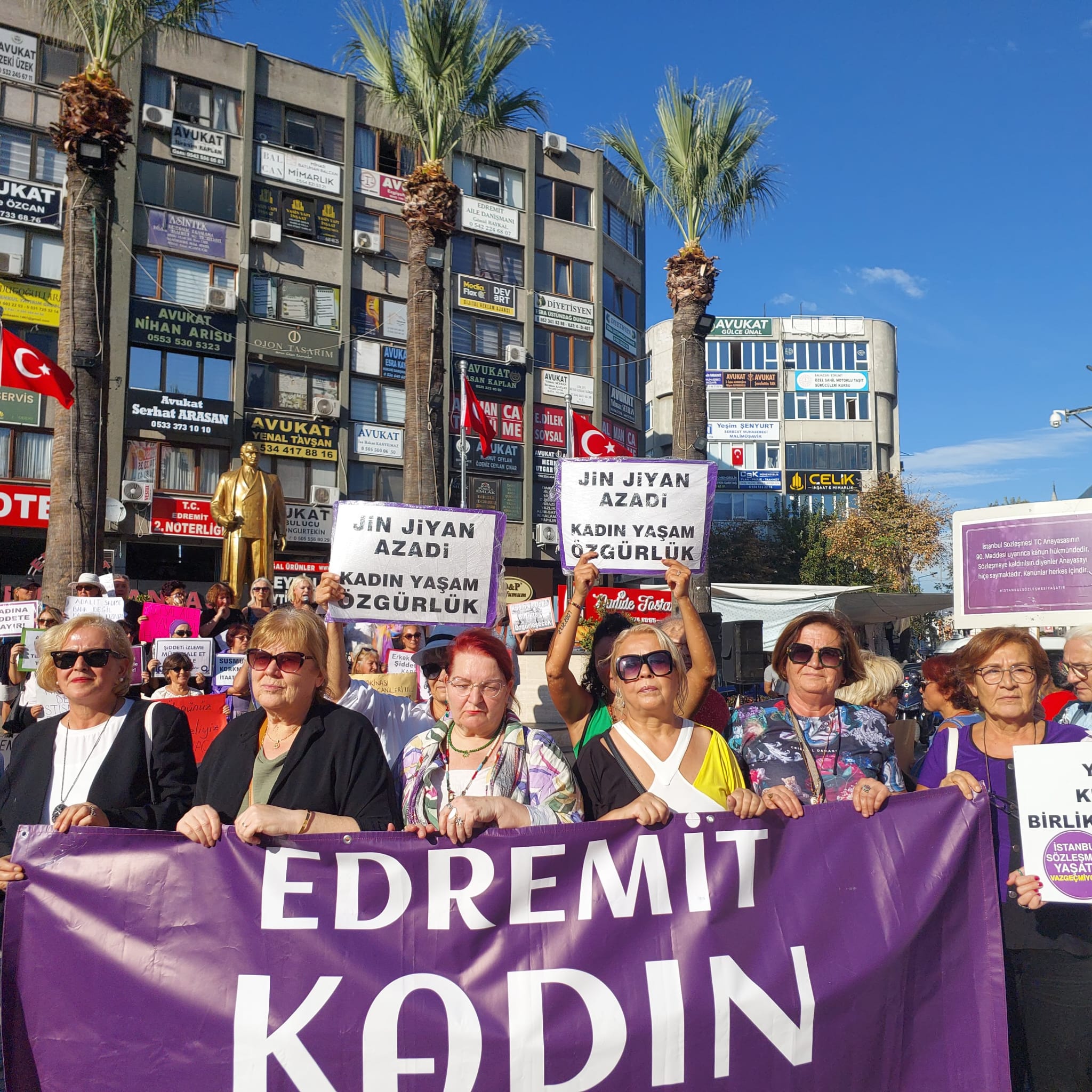 Edremit Kadın Platformu, Cumhuriyet Meydanı'nda bir araya gelerek kadın cinayetlerine yönelik sert bir basın açıklaması yaptı. Kadın cinayetlerinin artmasına ve faillerin cezasız kalmasına karşı öfke ve isyan dolu mesajlar veren platform, Türkiye'de kadınların can güvenliğinin tehlikede olduğunu vurguladı.