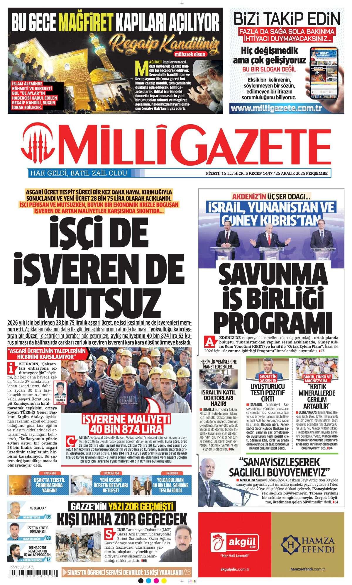 Milli Gazetesi 25 Aralık 2025 Günü Gazete Manşetleri