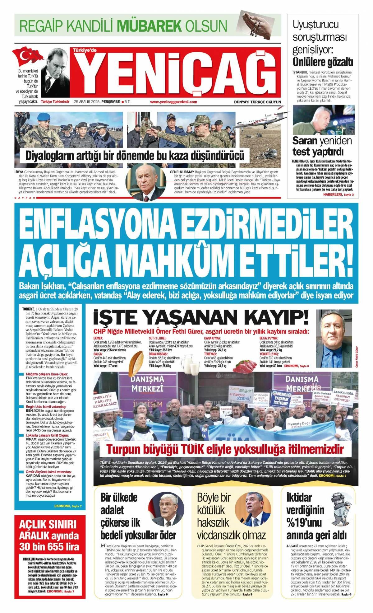 Yeni Çağ Gazetesi 25 Aralık 2025 Günü Gazete Manşetleri