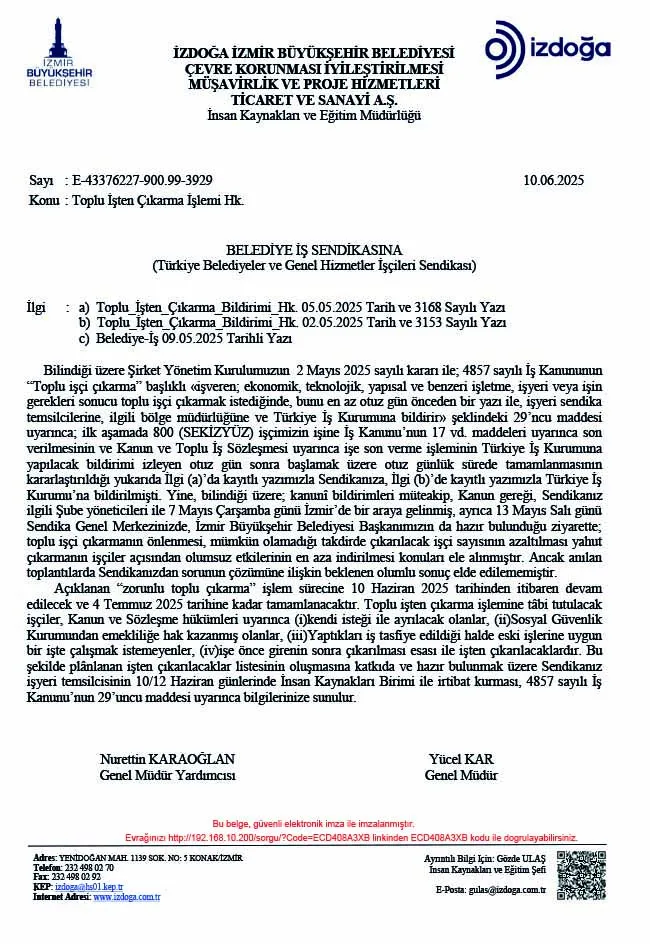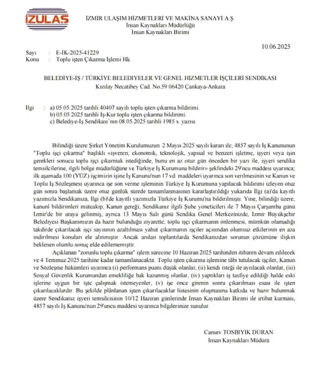 İzmir Büyükşehir Belediyesi, Belediye-İş sendikasına gönderdiği resmi yazıyla belediye bünyesindeki İZDOĞA’dan 800 ve İZULAŞ’tan 100 kişinin işten çıkarılacağını bildirdi.