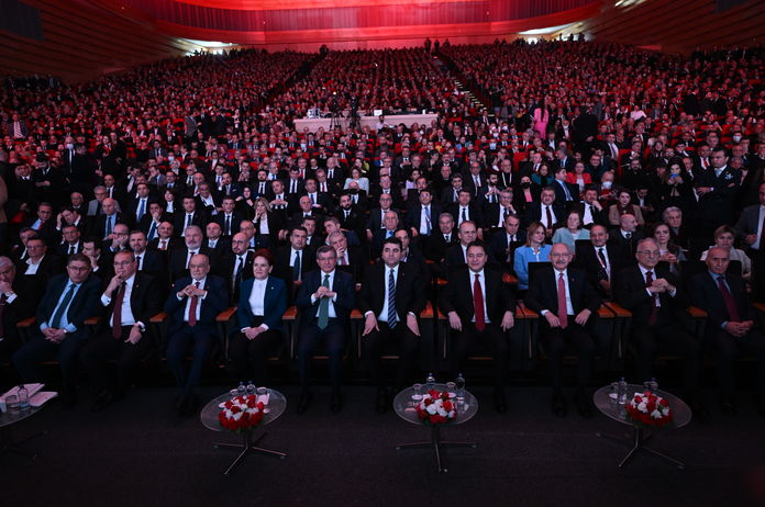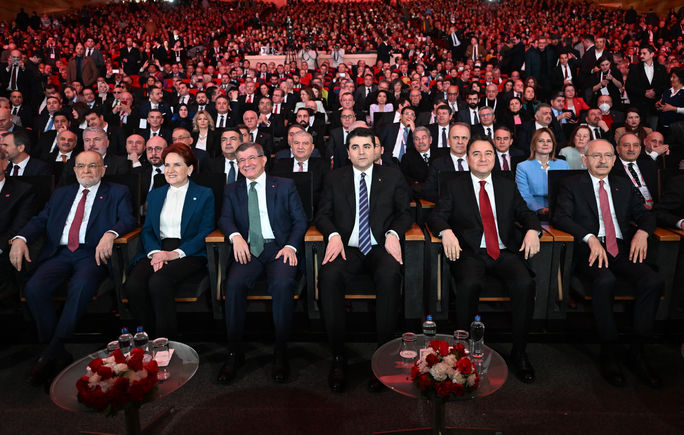 Altılı masayı oluşturan siyasi partilerin genel başkanları, Ankara’da Congresium Kongre ve Sergi Merkezi’nde Ortak Politikalar Mutabakat Metni Tanıtım Toplantısı’na katıldı.