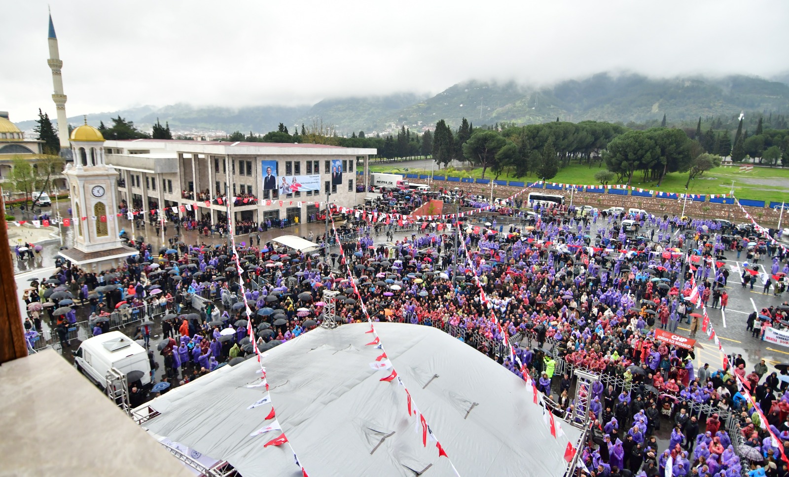 “Biraz önce başkanlarım söyledi. Parti büyük bir saldırı altında. Ama biz bu kumpasların ne olduğunu biliyoruz. Cumhuriyet Halk Partisi hiçbir algı yönetimine terk edilecek ve bunlardan korkup geri adım atacak, sinecek, konuşmayacak, teslim olacak bir parti değildir. Normal bir siyasi parti kaldırdığımız yükün 10’da birinde ezilir. Ama bu parti Seyit Onbaşı’nın partisidir. Yükten yılmayan ve yükü görünce efsaneleşenlerin partisidir. Bu parti teslim olmayanların, kurşun bitince süngü takanların, tek de kalsa süngüye karşı şehadete koşanların ama Çanakkale’yi geçirmeyenlerin, Anadolu’yu teslim etmeyenlerin kurduğu partidir. Onun için yıllarca seçim kazanınca ‘milli irade, milli irade’ deyip sonra o milli irade kendi aleyhine tecelli edince ‘kirli irade’ diyenlerin, milli iradeyi baş tacı ederken milli irade böyle tecelli ettiğinde onu alaşağı edenlerin samimiyetsizliğini bu millet görmüştür. Genel Başkan seçildim, Kuzey Irak’ta üs bölgemizde şehitlerimiz oldu. O şehitlerimizin orada verilmesi ile ilgili kış şartları, İHA’ların koruyamadığı yerde, oranın geçici olarak boşaltılıp daha sonra yeniden ikame edilmesi ile ilgili profesyonel bilgiler varken, bunların açıklanmasını beklerken, önümüze bir kâğıt ittirdiler. ‘At imzayı. Bir A4’ün altında benimle birleş’ dedi AK Parti. Dedim ki ‘Kendim kınıyorum terörü ama sizinle bu imzada birleşip, sizin peşinize takılacak bir parti değildir Cumhuriyet Halk Partisi.’ Sonra şehitlerden biri memleketimizdeydi. Geldik, havaalanında karşıladık. Şu mübarek caminin bahçesine doğru gelirken telefonlar geldi; ‘Hazırlık var, size karşı saldırı yapacaklar.’ Dedi ki o dönemin sayın valisi, emniyet müdürü için ‘Bilgi verdi.’ Dedim ki ‘Ben kendi şehrimde şehit cenazesine gitmeyecek olsam Atatürk’ün partisinin koltuğuna talip olmam.’ Geldik oraya ve orada bir takım sonradan raporlarla çıktı… Yunus Emre Belediyesi’nden, büyükşehir belediyesinden ve Kırkağaç’tan getirilmiş birtakım kişilerle caminin içine sokmuşlar. Çünkü Manisa’da Özgür Özel’in yüzüne bakıp da o lafı söyleyebilecek kimse bulamazlar. Oradan tezahürat ediyorlardı; ‘Özgür Özel dışarı’ diye. Namazımızı kıldık, gittik. Çıkarken bir uğultu, bir hengâme. Güya televizyonlarda; ‘Özgür Özel’e memleketinde saldırı.’ Ertesi hafta 6 şehit daha geldi, aynı kâğıdı koydular. Dedim ki ‘Ben sokağı biliyorum ve bu imzayı yine atmıyorum. Durduğum yerde duruyorum.’ Bu sefer hiçbir muhalefet partisi atmadı. Sonra ne oldu biliyor musunuz arkadaşlar? İşte bu caminin bahçesinde olduğu bu belediyeyi iki kişiden birinin oyuyla; Manisa’yı yüzde 60 oyla aldık, o olay olduktan üç ay sonra.”
