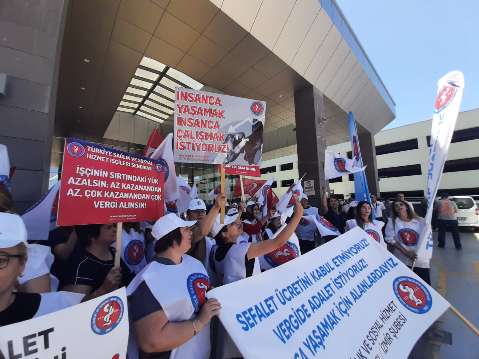 Türkiye Sağlık ve Sosyal Hizmet İşçileri Sendikası’nın (Sağlık İş) çağrısıyla Manisa Şehir Hastanesi önünde toplanan sağlık işçileri, TÜHİS (Türk Ağır Sanayi ve Hizmet Sektörü Kamu İşverenleri Sendikası) ile imzalanacak olan Kamu Çerçeve Protokolü görüşmelerinde teklif edilen yüzde 17’lik zammı kabul etmiyoruz dedi.