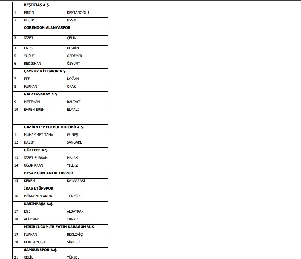 AÇIKLANAN LİSTEDE YER ALAN FUTBOLCULAR